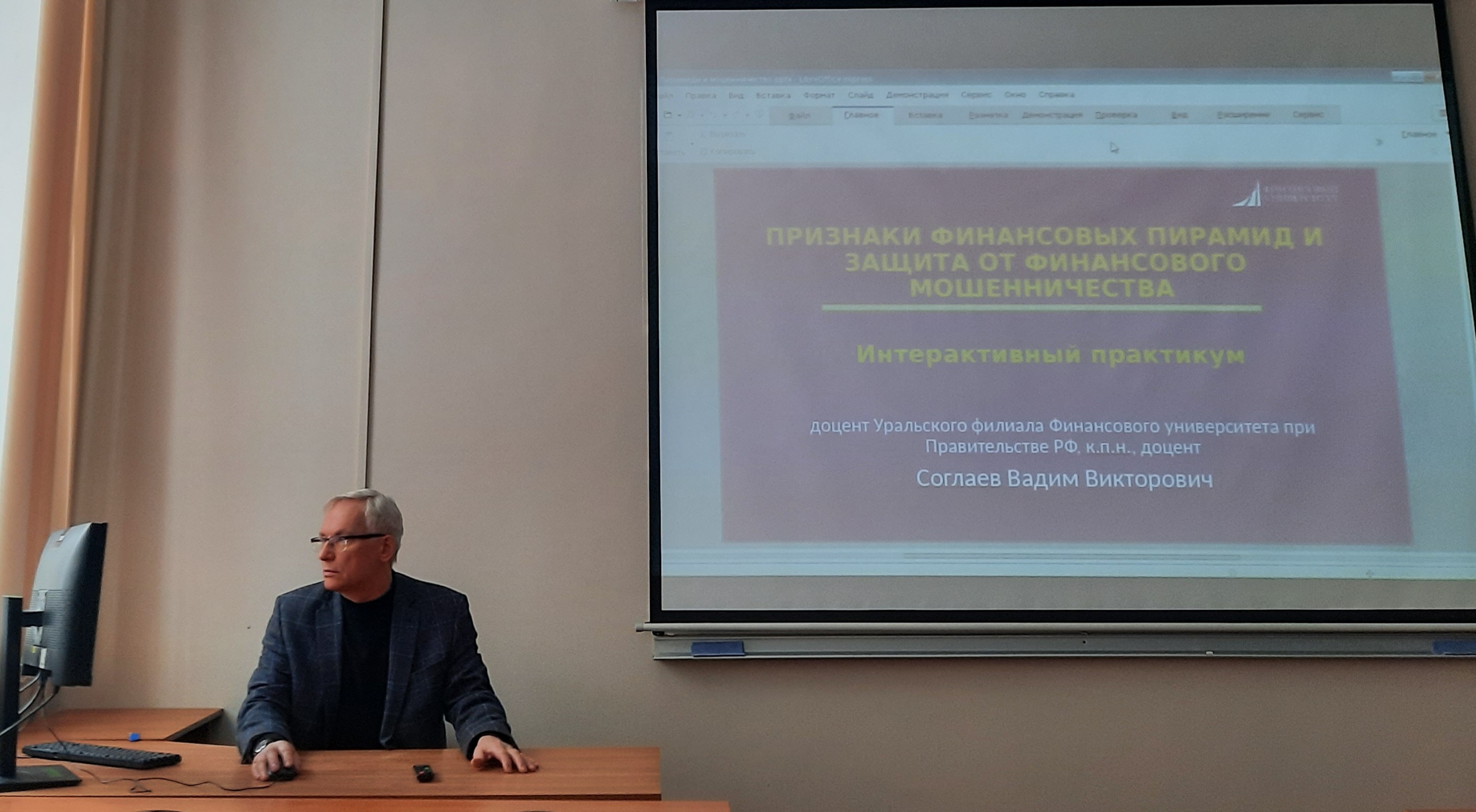 Занятие в формате интерактивного семинара провел кандидат педагогических наук, доцент кафедры «Социально-гуманитарные и естественно-научные дисциплины» Вадим Викторович Соглаев. Тема занятия – «Признаки финансовых пирамид и защита от финансового мошенничества».