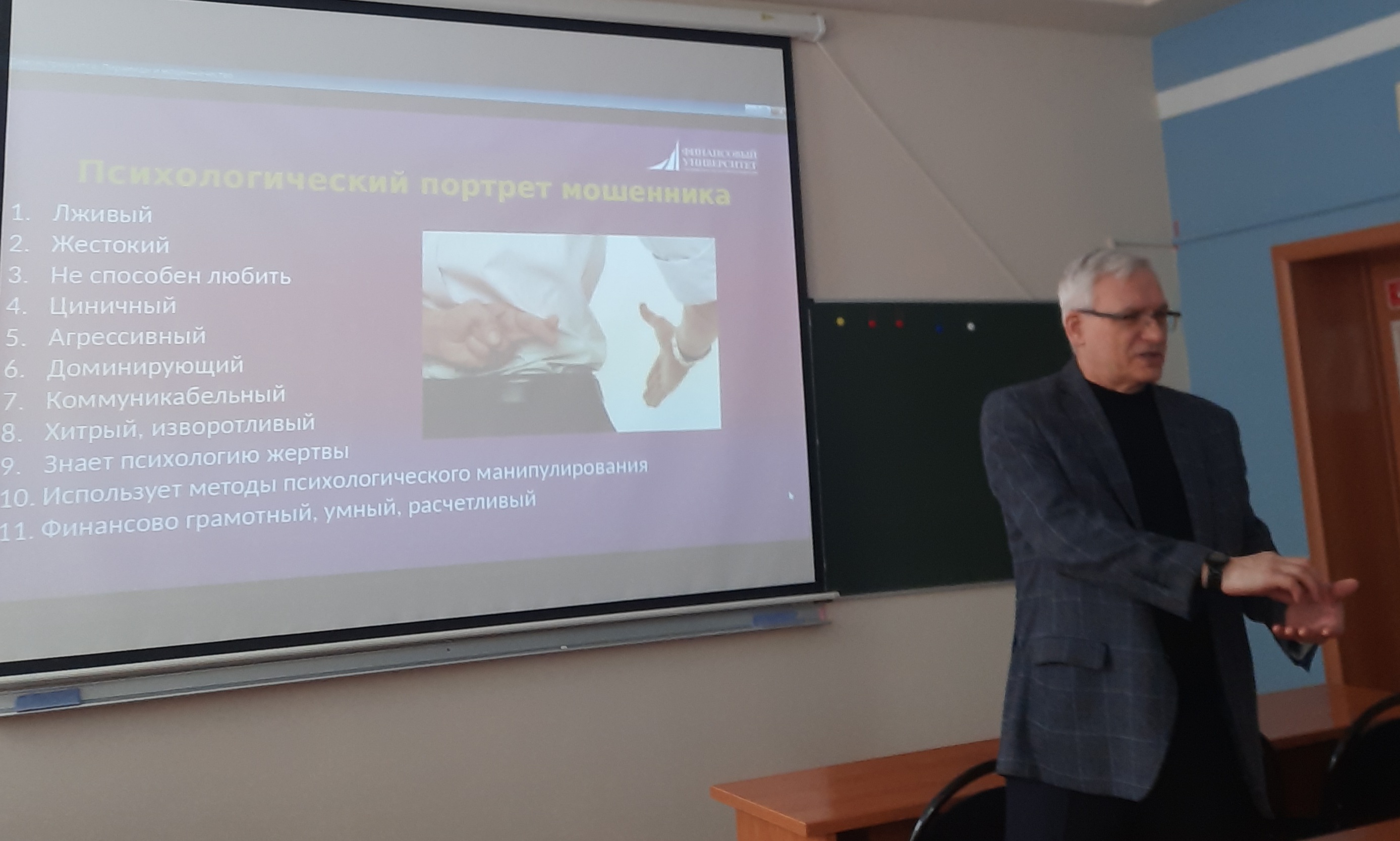 Вадим Викторович познакомил студентов с понятиями «финансовое мошенничество», «финансовая пирамида», «обман» в юридическом и психологическом контекстах. Виды финансовых пирамид, их особенности в историческом и современном аспекте с примерами обсудили в ходе семинара. Далее студенты рассмотрели психологические портреты мошенника и потенциальной жертвы. Участники мероприятия поделились личным опытом встречи с разными формами мошенничества.