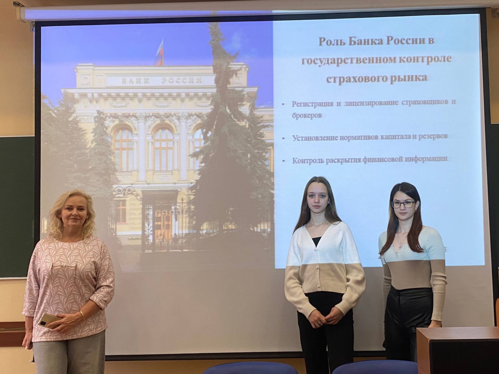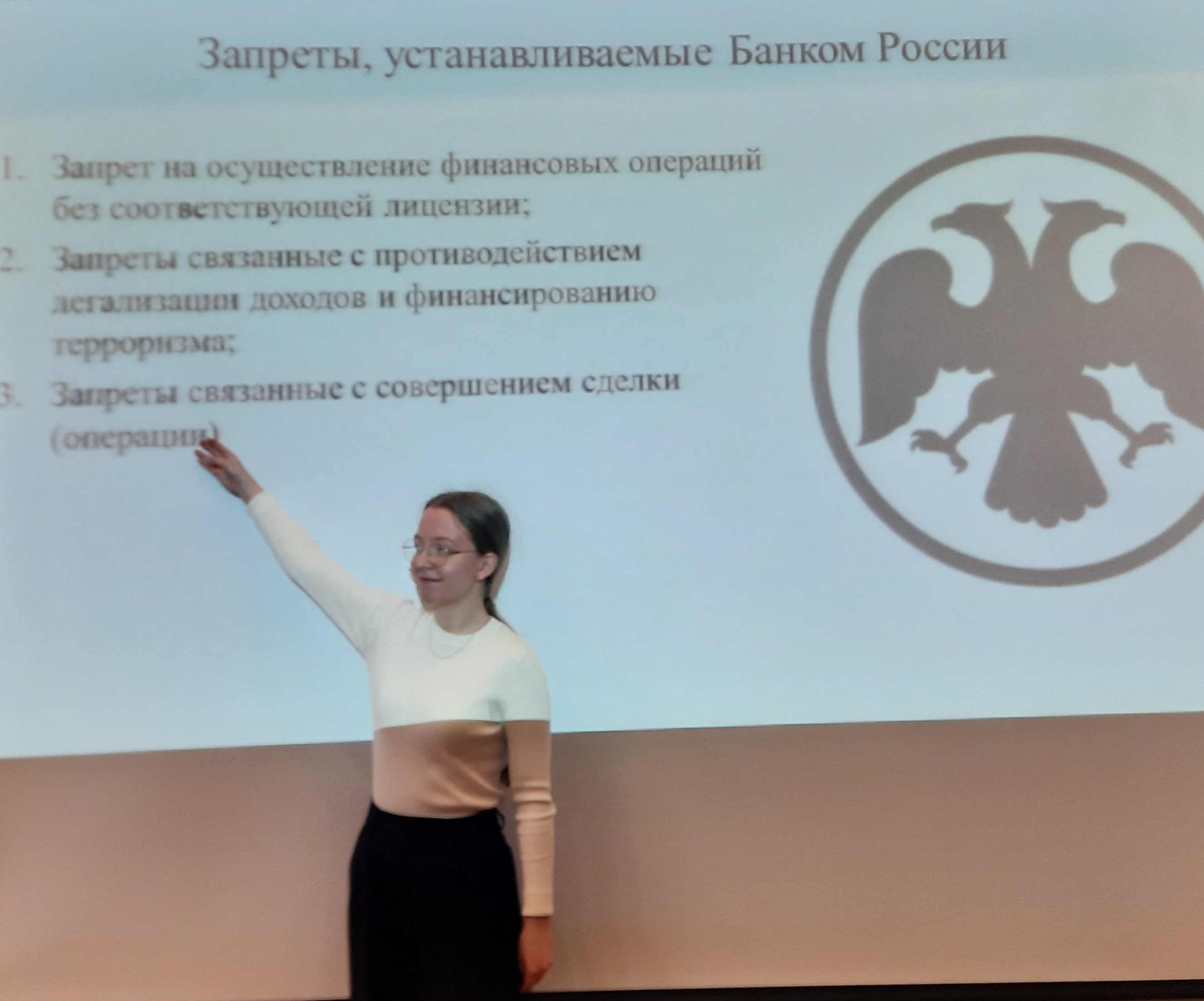 С актуальными требованиями, предъявляемые Центробанком РФ к кредитным организациям при получении ими лицензии участники мероприятия познакомились в докладе Лады Нехаевой. Активное обсуждение новых изменений ограничений и запретов, устанавливаемых Банком России к кредитным и страховым организациям прошло после заслушивания докладов Аникеенко Ксении и Шамониной Александры. Неверова Арина представила аналитический материал об ответственности кредитных организаций за нарушение банковского законодательства, приведя конкретные примеры из практики по каждому виду ответственности. Значительный интерес вызвал доклад Ангелины Булатовой и Тимура Рубашникова о порядке лицензирования страховой деятельности, а также доклад Анастасии Егоровой и Светланы Жуковой о полномочиях органа страхового надзора.